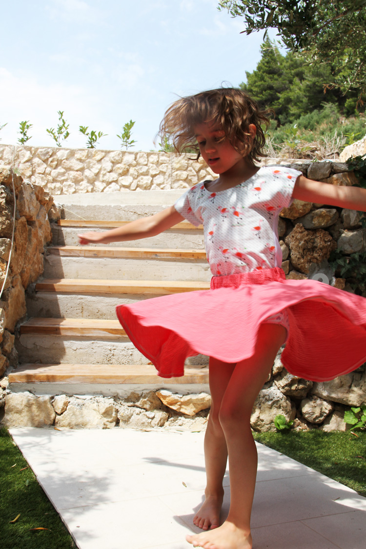 Hooray! That's what your girls will scream with excitement when they put this skirt on for the first time, it's so flowy and you can twirl it around! And you'll be thrilled too because you can download this skirt pattern for free! Girls' skirt JUNE is basically a circle skirt and is made up of four parts (+ waistband), so it is easy to sew, looks nice, and is comfortable to wear.
