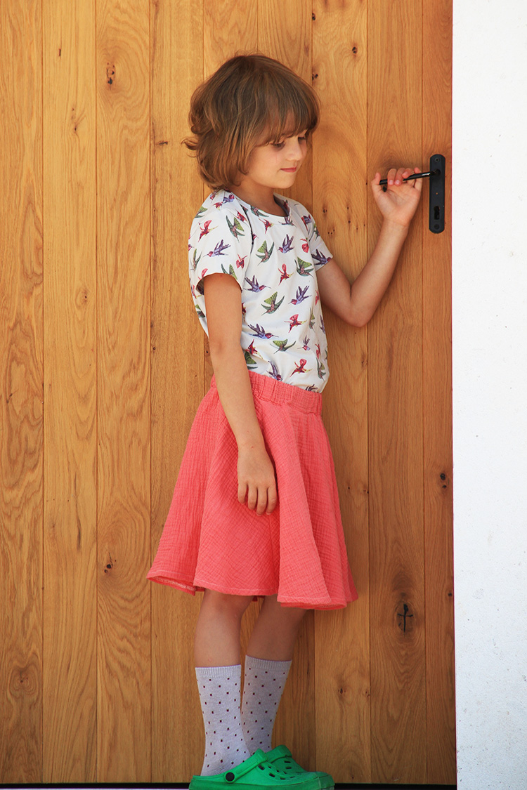I used this amazing material for the salmon skirt for Terulka: Double gauze. If you don't have experience with this material yet, I recommend trying it out. It's just perfect for summer clothes - it's wonderfully breathable, lightweight, and terribly comfortable. But beware - once you try it, you will fall for it! :)