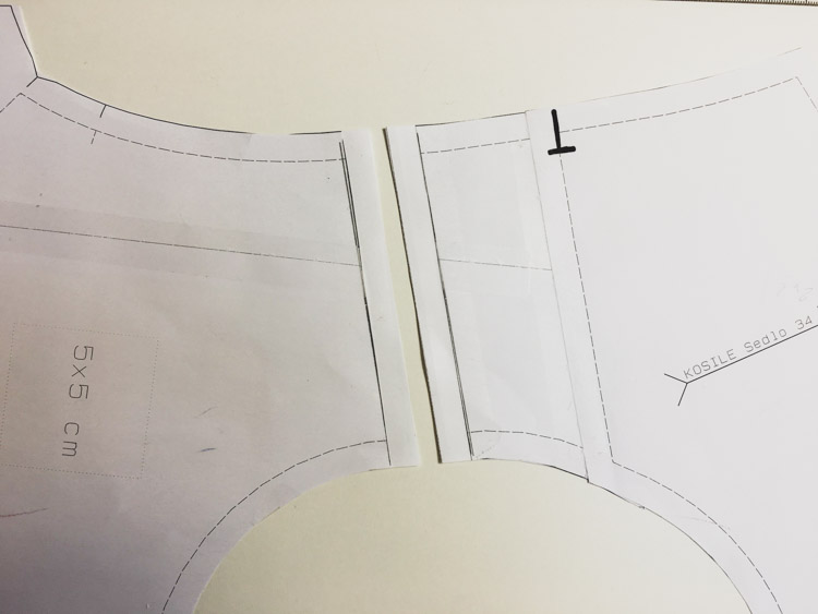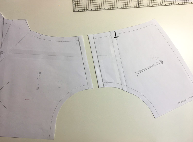 It is also very important to mark the button placket, its fold line and tis centerline. Let’s take it from the left side - there is a 2 cm wide seam allowance, then there is a seam allowance fold line, 2 cm to the right is a button placket fold line and the rightmost mark is the center line (there will be buttons and buttonholes on this line). when you overlay two front pieces, as if you wanted to button up the shirt (the centerlines lie on top of each other), there should be a 2 cm wide overlap.