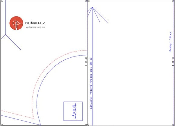 - Individual sizes view (“template view”) – pattern files for individual sizes with the seam allowances outlined (the sewing lines are marked red and the overall piece shape including seam allowances is blue).