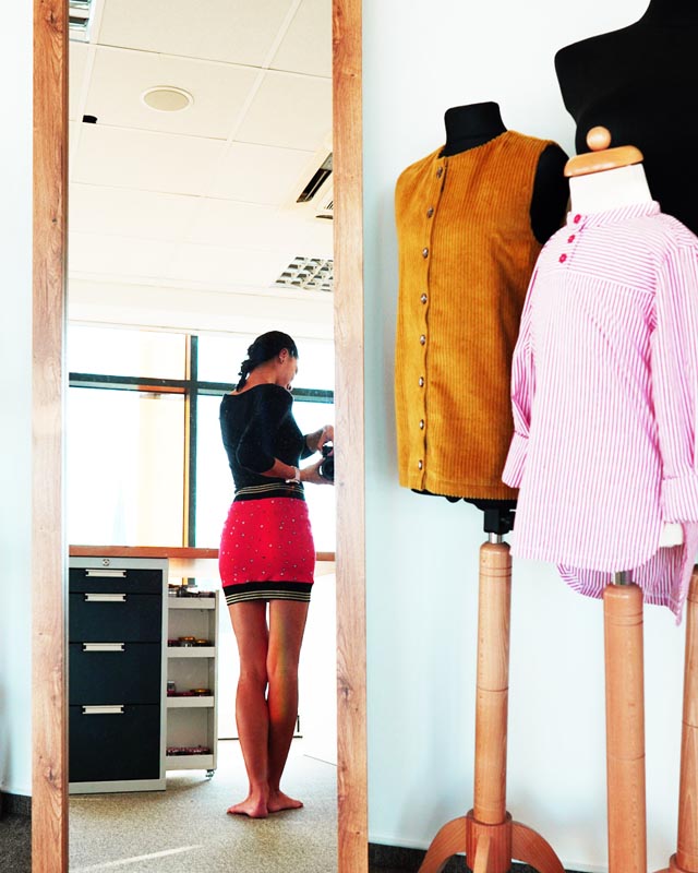 The pockets can be sewn in two ways - as classic round pockets or with a distinctive lining. You can have two pockets on your skirt or just one.