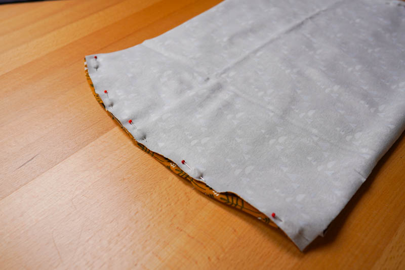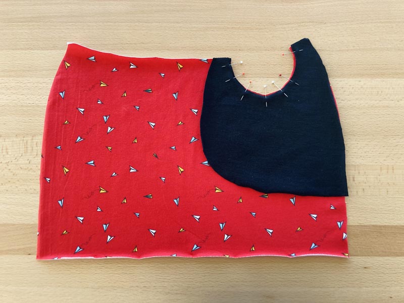 Take the front piece and put it right side up. Lay the pocket piece with a pocket opening over the front piece (right side to the right side). Pin the two pieces together (in the pocket opening area).