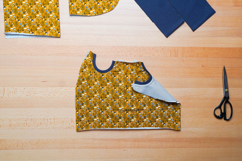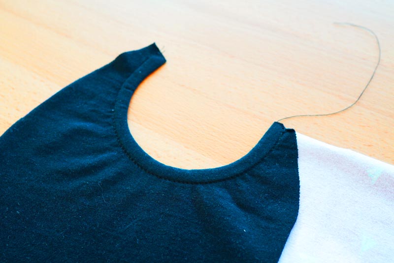 Lay the front piece (right side up) on your table and put the back piece over it (right side down). Pin and sew both side seams (use elastic stitches).