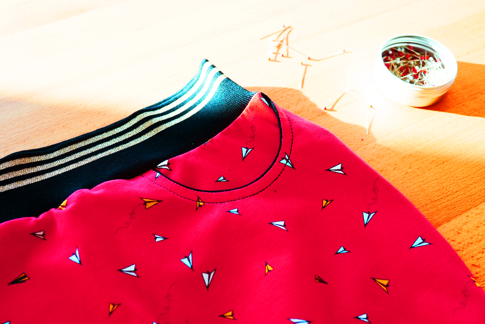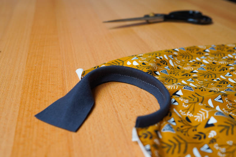 Now sew the pocket piece with an opening to the skirt - the skirt piece (right side up) forms the bottom layer, the strip of rib knit rests on top of it (twisted so that its cutting edge is flush with the cutting edge of the skirt) and the pocket piece with an opening is on top (right side down). Sew the whole "sandwich" very slowly to keep all the layers in the correct position. Use an elastic stitch (e.g. three-step straight stitch).