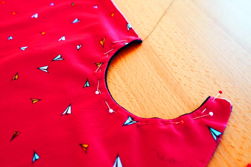 Sew the pocket piece to the front piece (just the pocket opening part). Slip the pocket piece under the skirt. You can let the edge of the pocket piece peek out slightly above the edge of the pocket opening of the front piece - it creates an interesting contrasting element. If you don't want to do that, place the pocket piece so that no part of it peeks out. Pin (or baste) the pocket opening in this position.