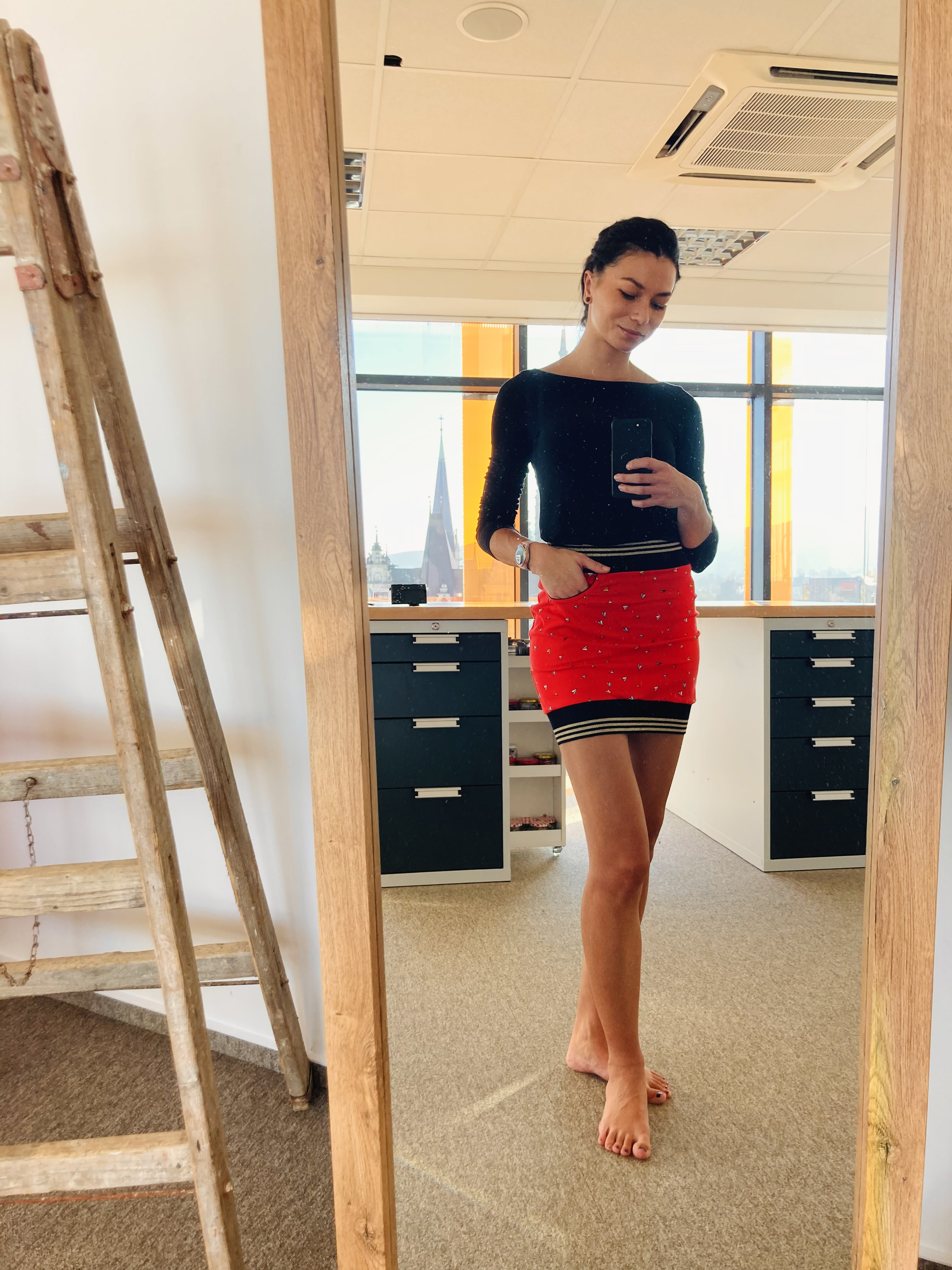 Sew the hems to the skirt (use elastic stitches). Turn the skirt face side out and iron it. Wear your new skirt with joy! ♡