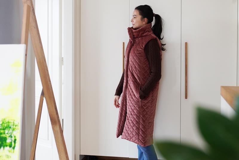 Open the back lining part and iron it. A small counter-fold will be created in the thoracic spine for good mobility and comfort of the vest during wear.