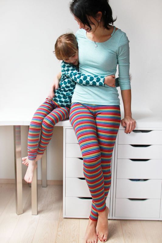 I'm not a big fan of wearing leggings in public, but I like to wear them at home or for exercise. And recently I noticed that all my leggings are black and I decided to change that. I sewed one pair of these cheerful leggings for myself and one for my daughter Terulka. I photographed the whole process and added patterns for leggings to my online store, so in today's article, I can show you how to sew leggings in 5 steps.