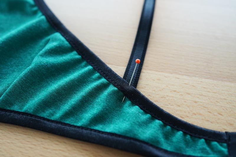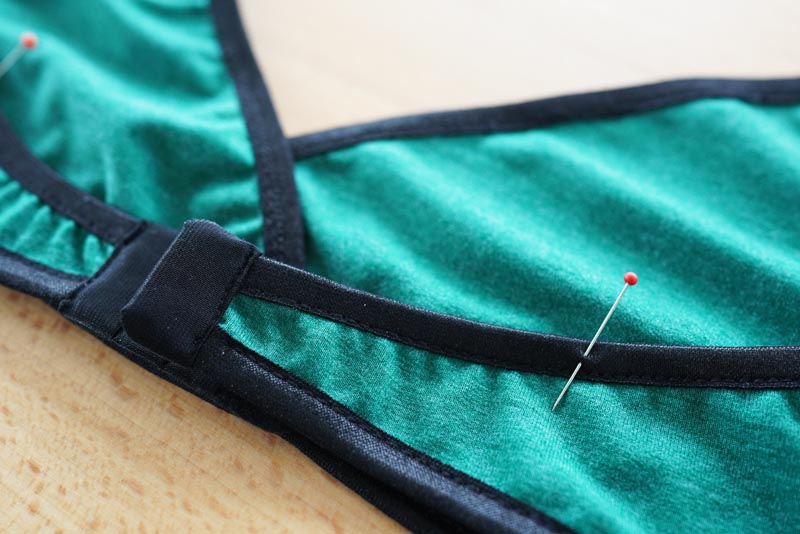 Pin the shoulder straps band to the back pieces. I used 25 cm / 10” long pieces (size 65). I recommend measuring the appropriate length on a bra that fits you. Don't forget that the strap will be threaded through to the shortener/slider twice.