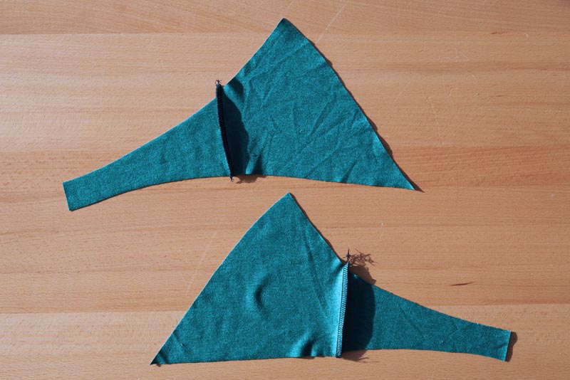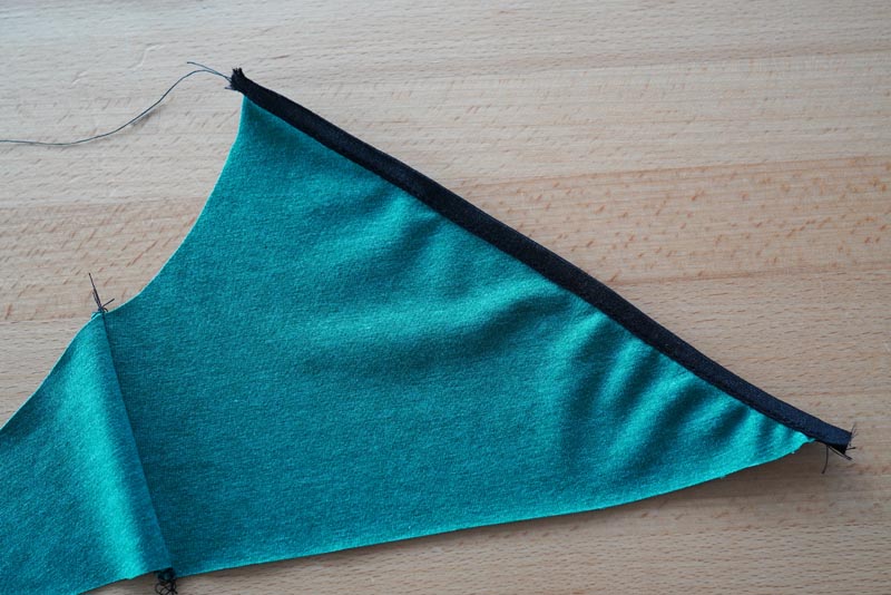 When sewing the last part of the hem, prepare the corners of the cups for sewing the shoulder straps in the following way. Start hemming at the edge of the back piece (where the hook & eye closure will be) and work towards the top of the cup. Don’t cut the end of the hem too close to the bra - leave about 25 cm / 10” (for sizes up to 90 cm / 35 1/2” underbust) to 35 cm / 14” (for sizes over 90 cm / 35 1/2” underbust) of the hem hanging freely from the top corner of the cup.