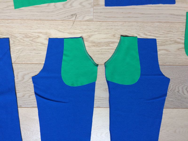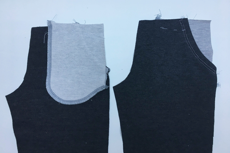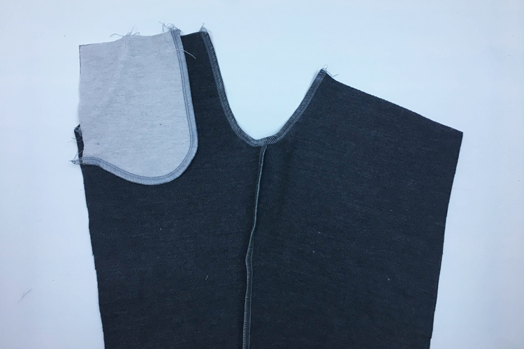 To sew the yoke, you first need to sew the instep seams. Lay front pieces over the back pieces (face side to face side). Align, pin, and sew the instep seams.