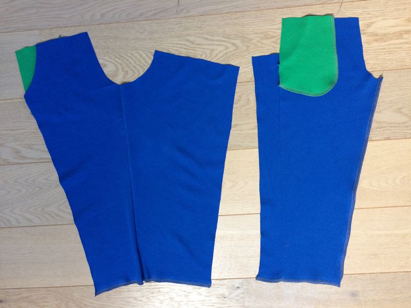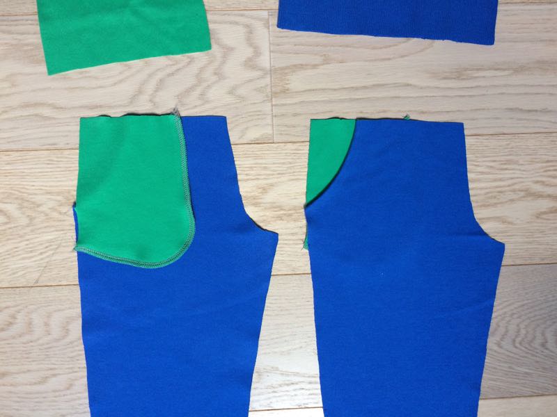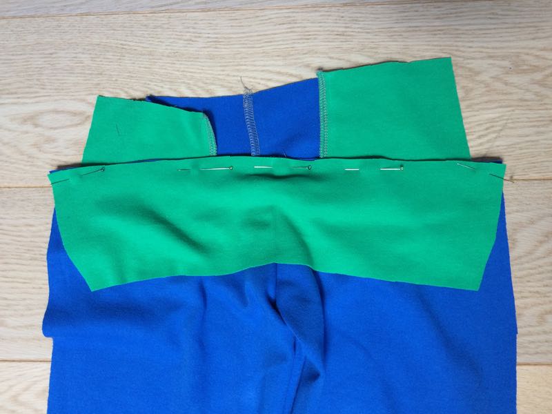 Now place the front pieces face side down. Lay the whole pocket pieces over the pocket pieces with openings (face side to face side), pin, and sew both pocket pouches. Don’t sew through the front pieces of the sweatpants.