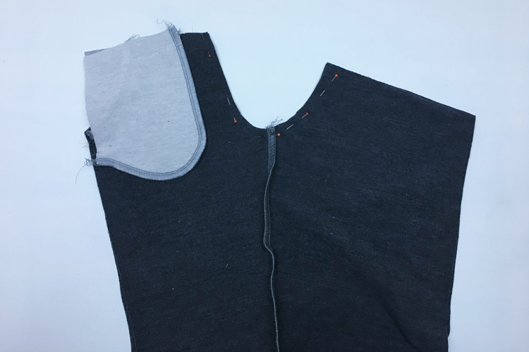 Let’s work on the pockets first. Lay the pocket piece over the front piece (face side to face side), pin, and sew the pocket opening.