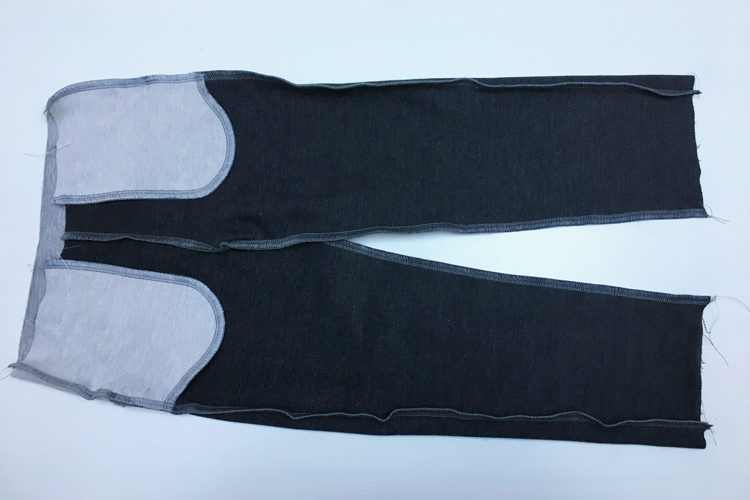 Put the two legs on top of each other (face side to face side) and sew both crotch seams in one go.