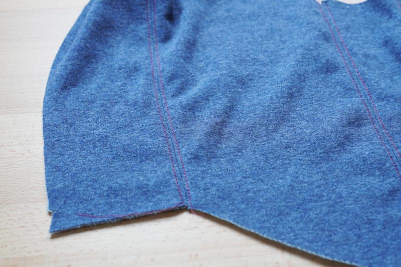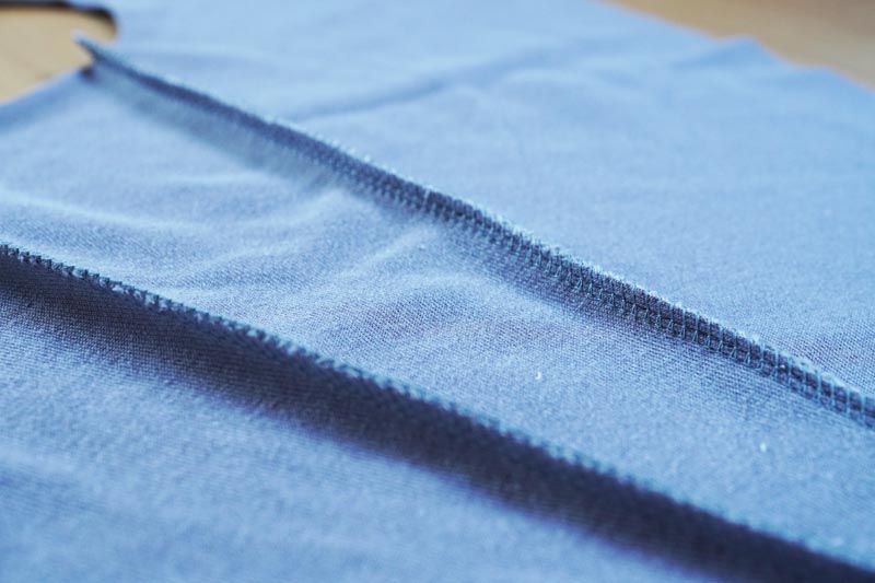 Lay the front pieces on one of the side pieces (face side to face side). Pin the pieces together and sew the first front seam. Don’t forget to use an elastic stitch. I used a three-step straight stitch, but you can also use a narrow zigzag stitch (or sew on your serger machine).