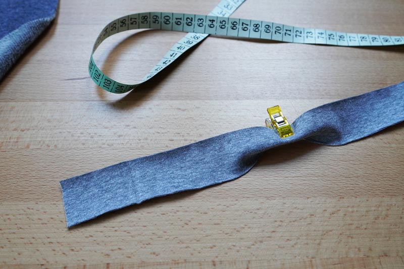 Cut your strip about 3.5 - 4 cm (1 3/8” - 1 5/8") wide. The narrower strip will form a nice subtle hem, but its use can be quite difficult for beginners. Wider strips are easier to work with, but the resulting wider hem may look too robust for smaller balaclavas.