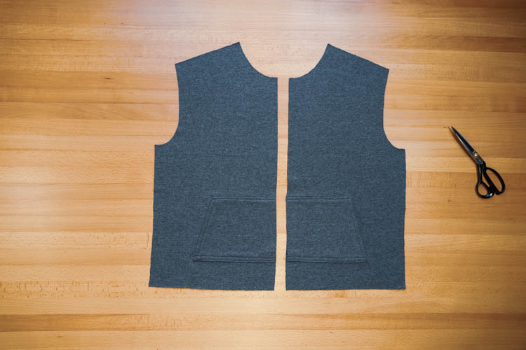 Then pin the shorter sides of the rib knit to the edges of the front pieces.