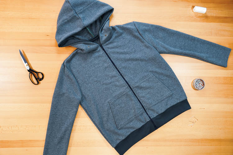 Evenly sew the rib knit to the bottom edge of the hoodie - it’s necessary to stretch the rib knit slightly.