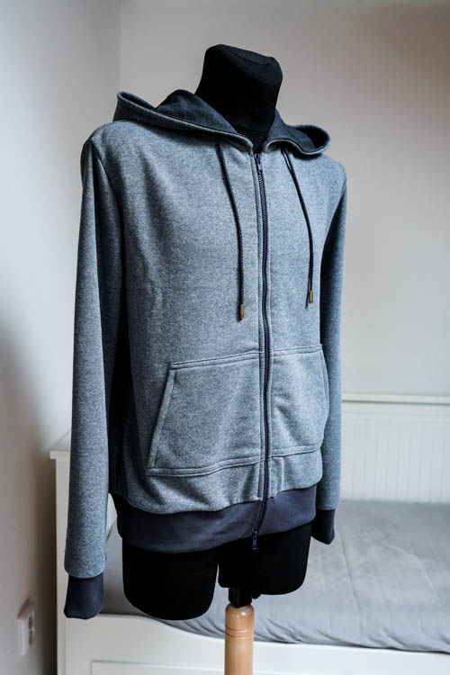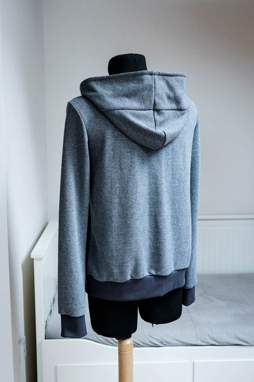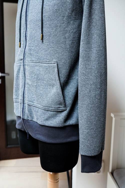 And this is what you should have so far - the bottom hem is finished, the zipper (including the topstitching) is in place as well as pockets that are symmetrically placed on both sides of the hoodie. The sleeves are there too, but I hid them under the back piece.