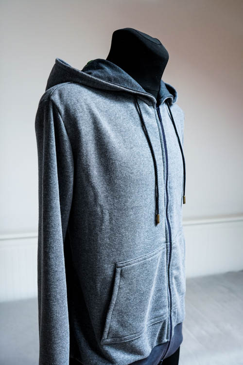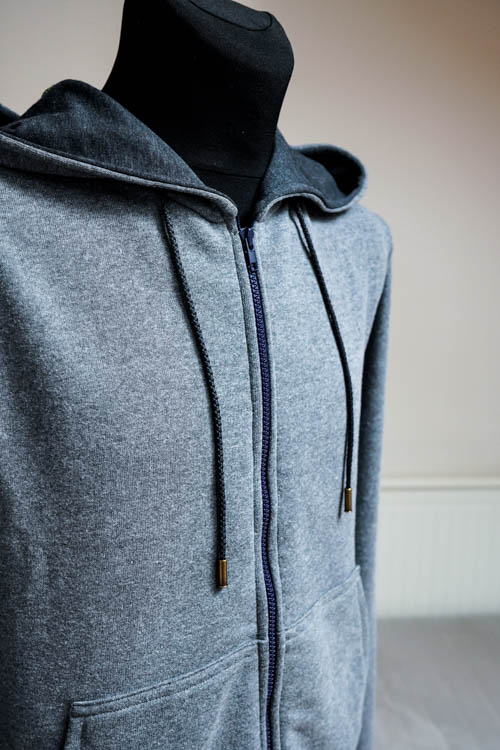 Here will be the lower end of the zipper. If you didn’t manage to buy a zipper of a suitable color and length, you can buy a longer (plastic) zipper and shorten it with pliers. You can read more about that here. The zipper for the men’s version of the hoodie is 70 cm / 28" long.