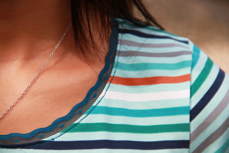 Carefully pin the lace to the neckline and sew it with an elastic stitch. I used my overlock machine. But you can also use a regular sewing machine & some elastic stitch.