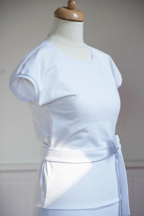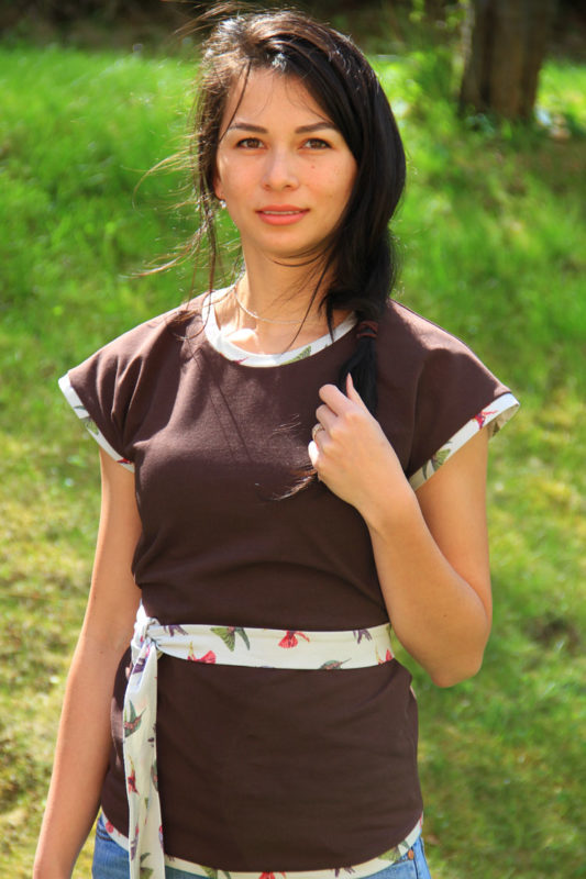 In this article, you will find sewing instructions for a simple T-shirt with short kimono sleeves. The sewing process is quite simple and is therefore suitable for beginners. The procedure is the same for sewing women's and children's T-shirts. I will show you how to sew several versions of a T-shirt - a basic version, a version with a tie, and a simplified version. This article also provides instructions for modifying the pattern to sew tunics.