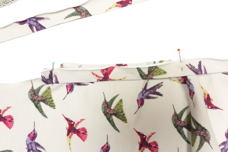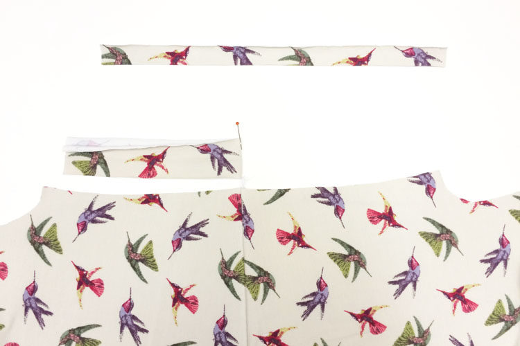 Then pin the other parts of the strip. Do not stretch the strip at all. Sew the hem of the front piece and then the hem of the back piece. Iron the hems and steam them well.