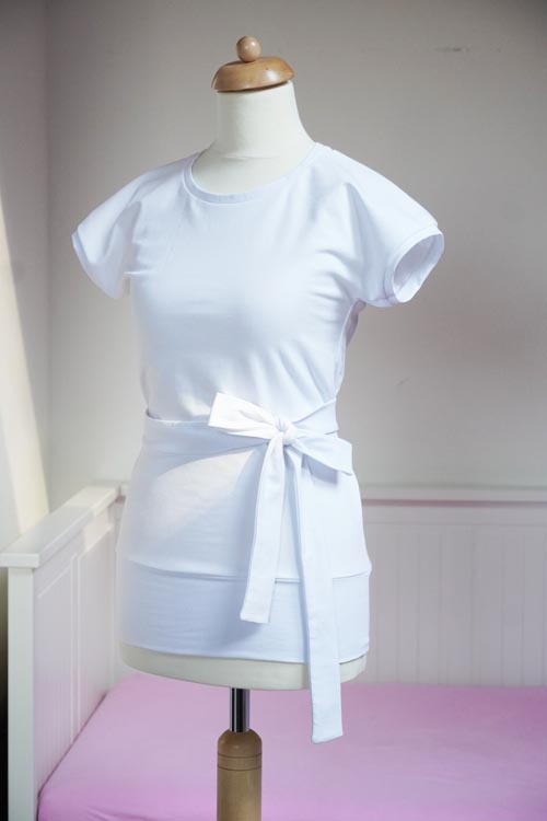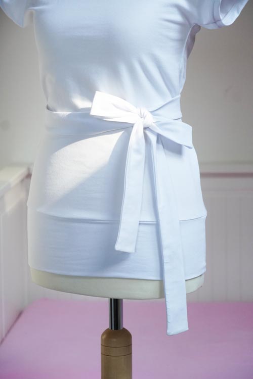 Put the shirt on so that you are looking at the face side of the front piece. Align the unstitched side of the tie with the marks (waistline).