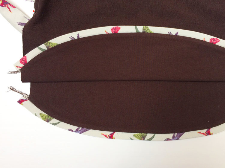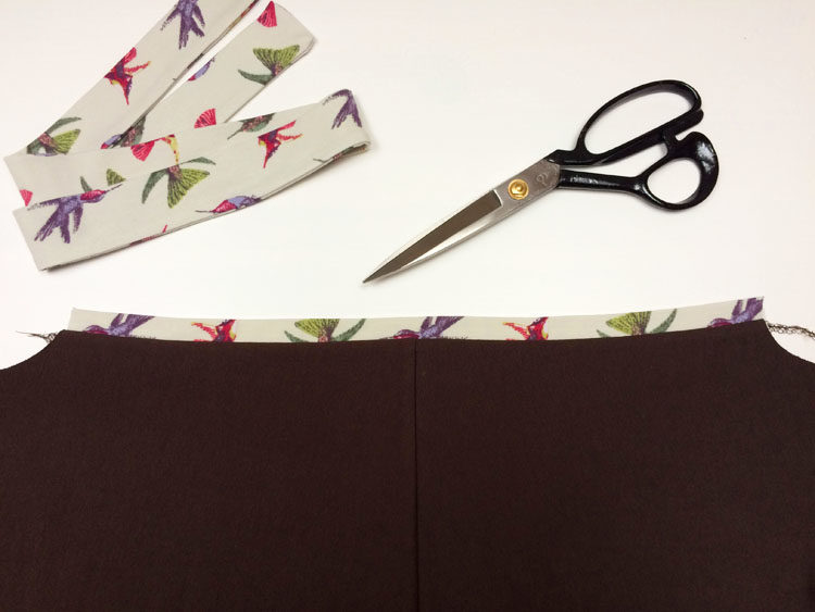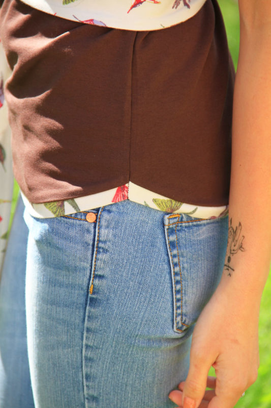 Hem bottom edges of the front and back piece in a similar way. Don’t stretch the strips when sewing the hems. The bottom edges are curved and if you stretch the strips while sewing, you will deform them.