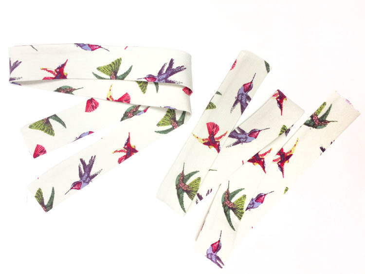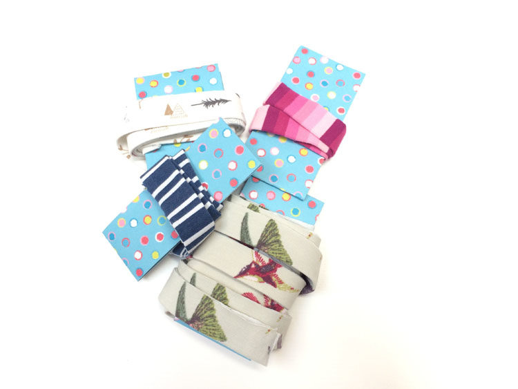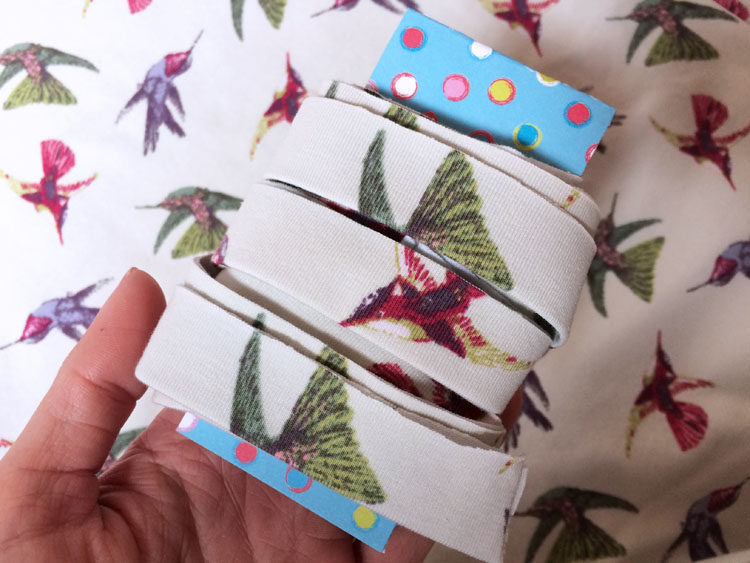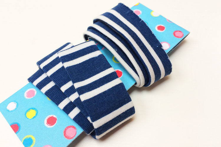 I like to cut my knit strips with a rotary cutter. It is faster and more accurate than cutting with regular scissors. Once you have your strip cut, fold it in half (lengthwise). If the edges of your strip twist, pin them (use glass head pins), steam the strip well, and iron it (until dry). Leave the pins in place and let the knit strip cool down. Then wind it (loosely) on a piece of cardboard.