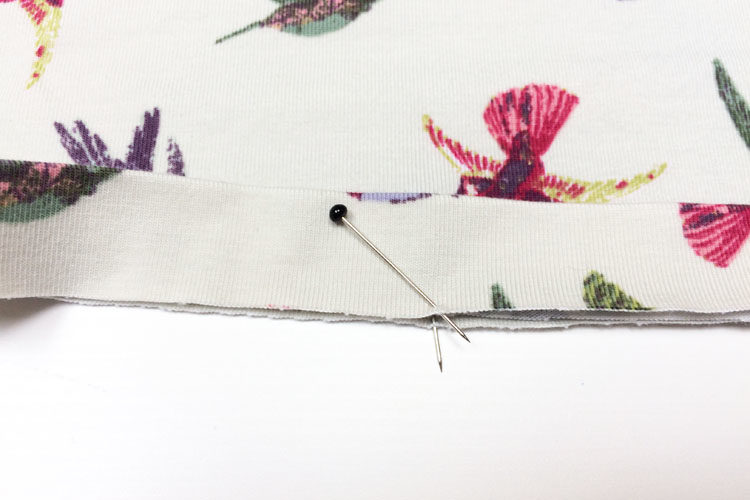 Fold the cutting edges 2 cm (3/4") to the inside of the sleeves and pin them there.