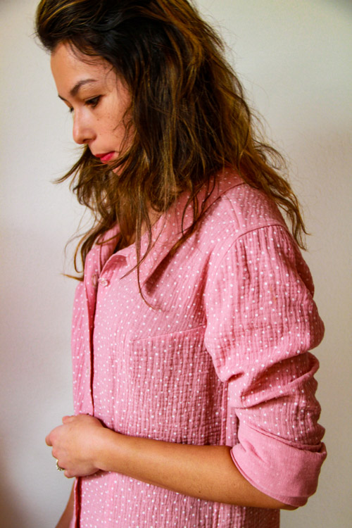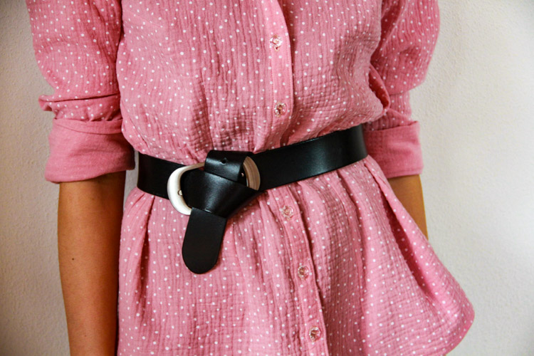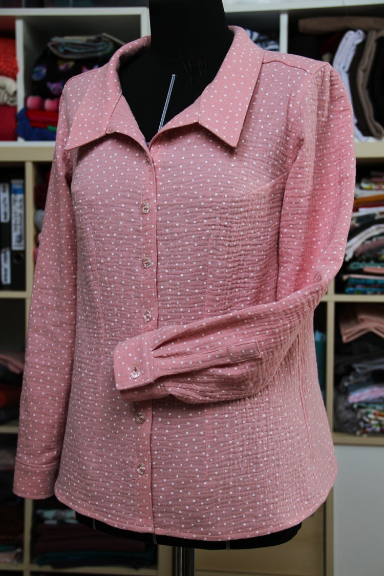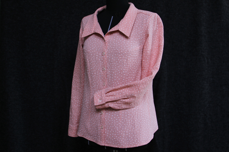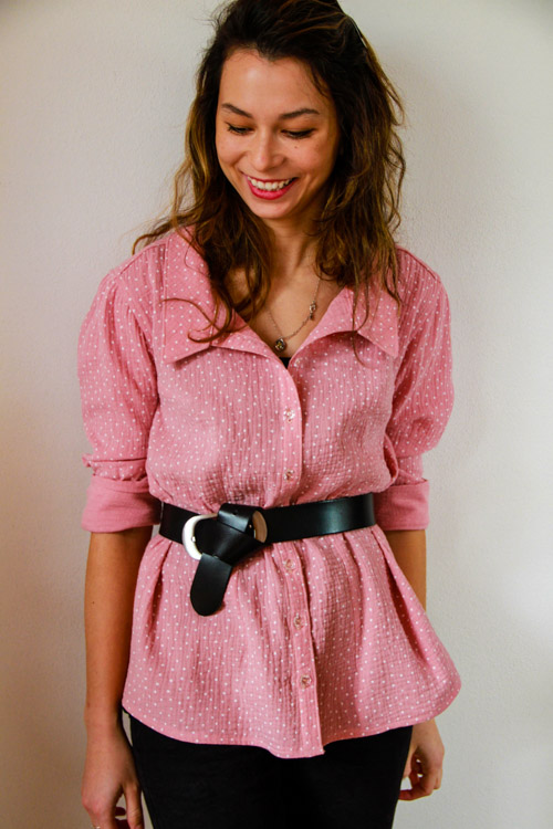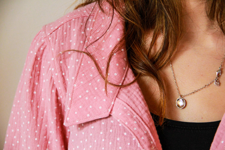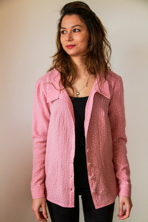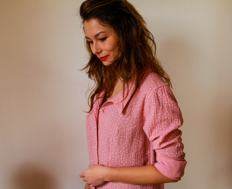Use light and flowing fabrics for this piece. Ideally poplin and other shirt fabrics and blouse fabrics. You can also sew a summer shirt from light viscose, for example. I used double gauze to sew my shirt for colder weather. You can get this material here: Double Gauze – Salmon / Polka dots (Double gauze - Various styles). This material is not entirely suitable for beginners because it is very lively. But if you are intermediate sewers (or a brave beginner), then go for it. :) All the materials I mentioned can be found in the Dumlatek.cz store.