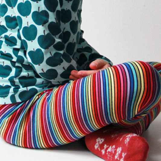 I sewed my cheerful striped leggings from a cotton knit with an admixture of elastane, which I bought on Unuodesign.cz: Knit - Stripes.