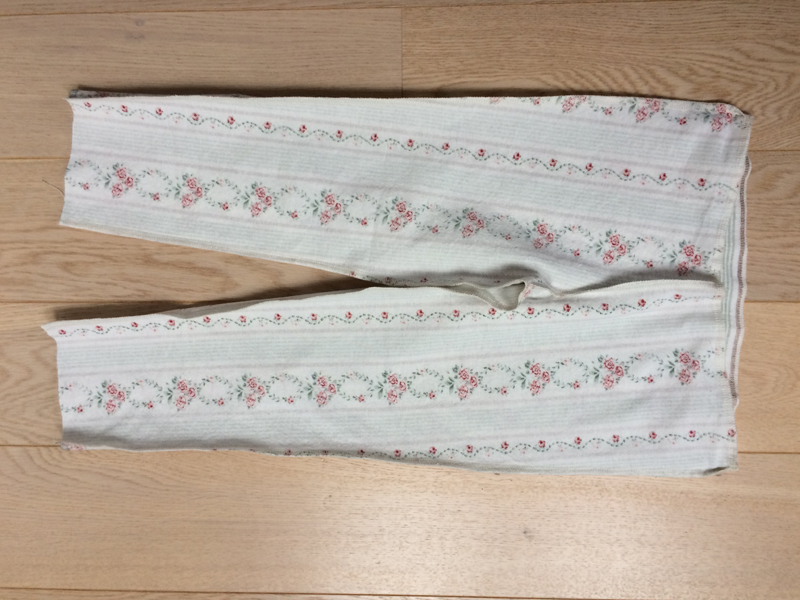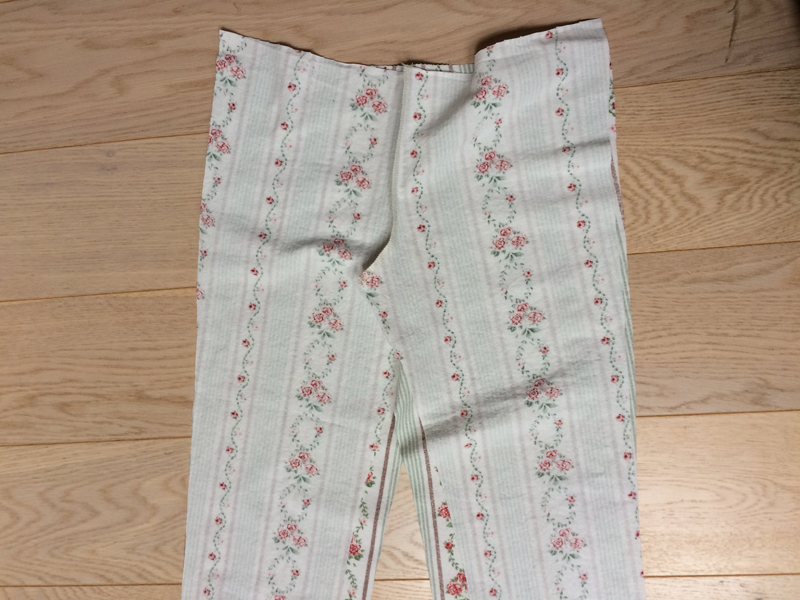 Lay the back pieces on top of each other (face side to face side) and sew the back crotch seam. Do the same with the front pieces and sew the front crotch seam. Lay the front pieces on top of the back pieces (face side to face side) and sew the side seams and instep seams.