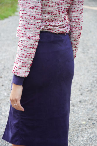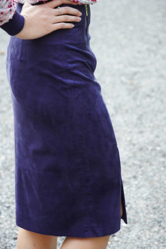 ✂Suggestion: I definitely recommend basting (temporary stitching) important seams. You want the skirt to be hugging your hips and bottom closely, so it’s important that it truly fits you well. Do this even if you decide to use some type of knit. It is very likely that you will want to tighten the skirt a little in the side seams because of the elasticity of the material.