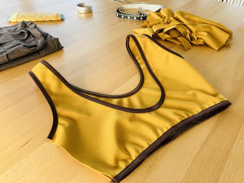 You can sew the bra on an overlocker or on a regular sewing machine. However, the seams must be elastic in both cases so that they do not burst. When sewing with a regular sewing machine, please follow the recommendations in this article: