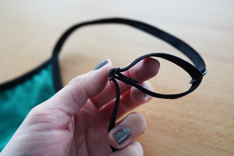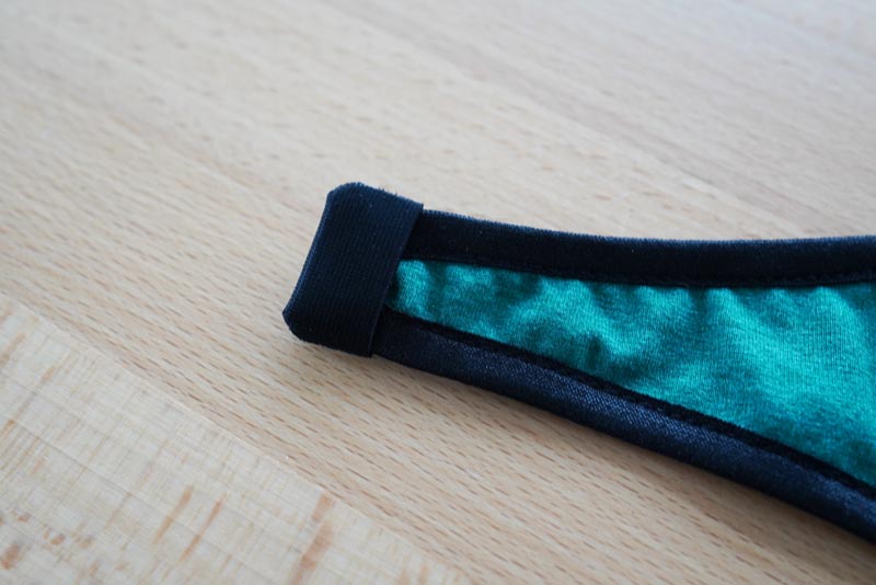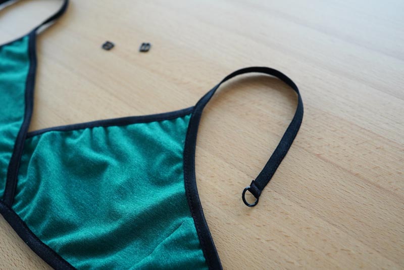 Thread the hems (which hang from the cups) through the strap rings. Fold the edges of the hems about 1.5 cm / 3/4" and topstitch them to attach the strap rings.