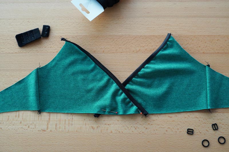 Pin the shoulder straps band to the back pieces. I used 25 cm / 10” long pieces (size 65). I recommend measuring the appropriate length on a bra that fits you. Don't forget that the strap will be threaded through to the shortener/slider twice.