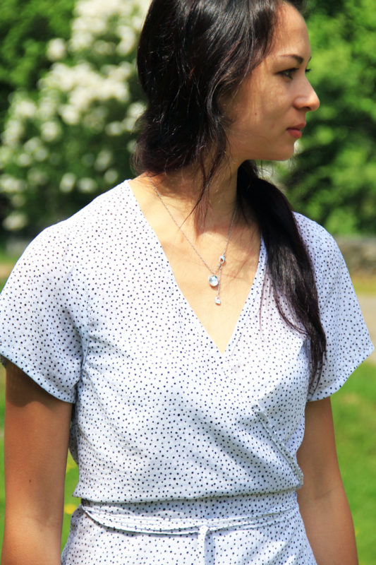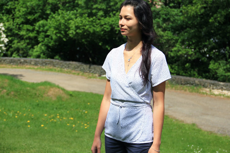 I have prepared sewing instructions for our new pattern for today, but don't worry, it's nothing too complicated. Today's article is about sewing a wrap blouse, so we'll avoid sewing button placket and collar. The pattern for women’s wrap blouse DOTS is constructed in a professional program for clothing pattern development and it is available in sizes 32–46. You can print the pattern on your home printer (A4 format) or a plotter (A0 format), you will receive both versions from us.