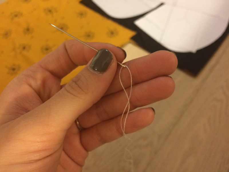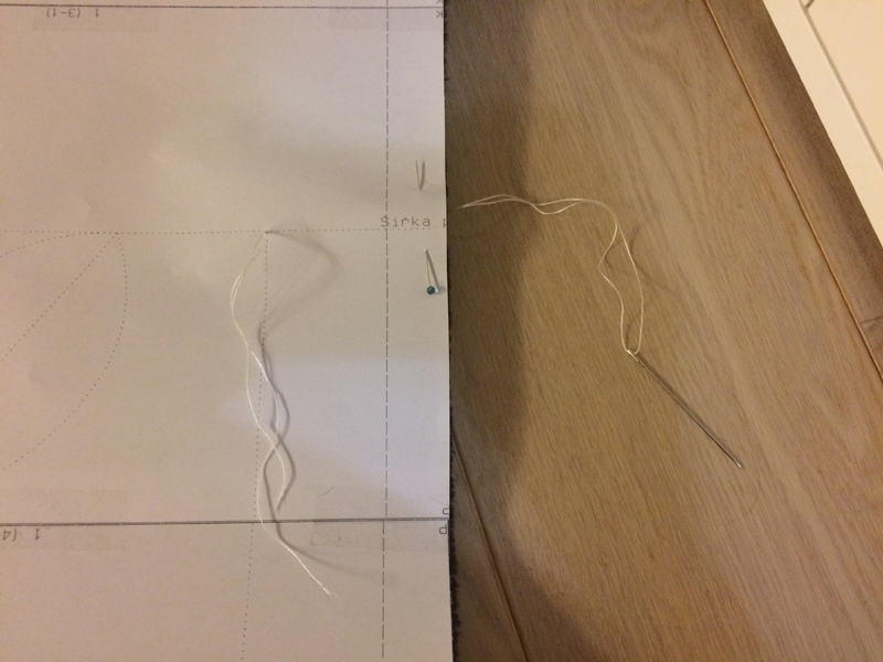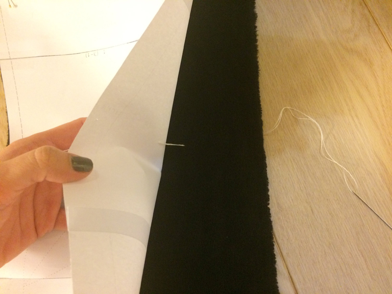 Transfer the marks showing the position of the pockets to the front pieces. I recommend transferring marks with a double-threaded needle. Pierce the paper piece and both layers of the fabric with your needle.
