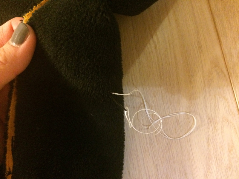 Clean the bottom edge and sleeve hems. Fold the bottom hem to the reverse side (over the bottom edge of the zipper) and pin it. Keep the size of this fold constant around the entire circumference of the sweatshirt. Topstitch the folded hem from the face side of the hoodie. Again - you can do this by hand for a more elegant look.