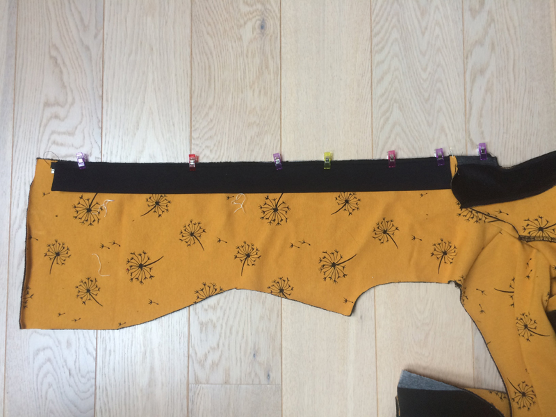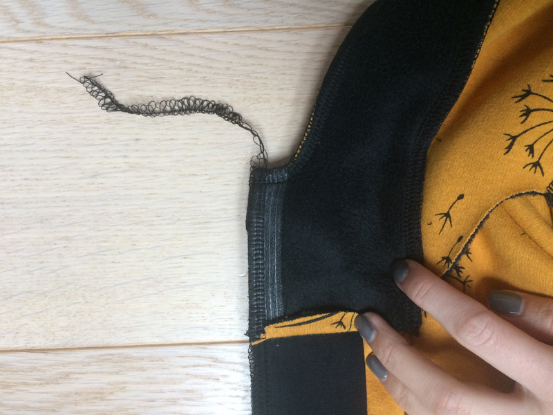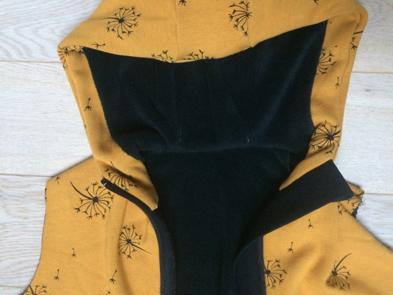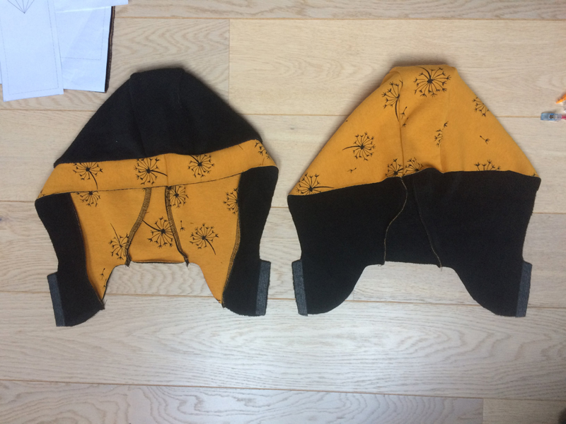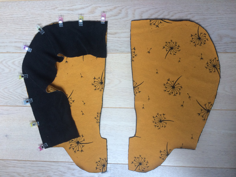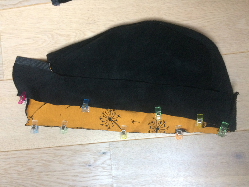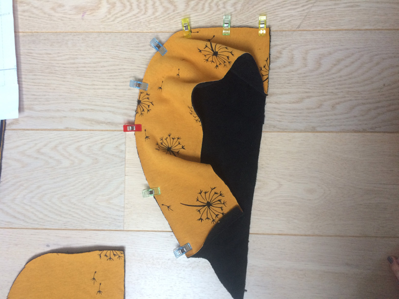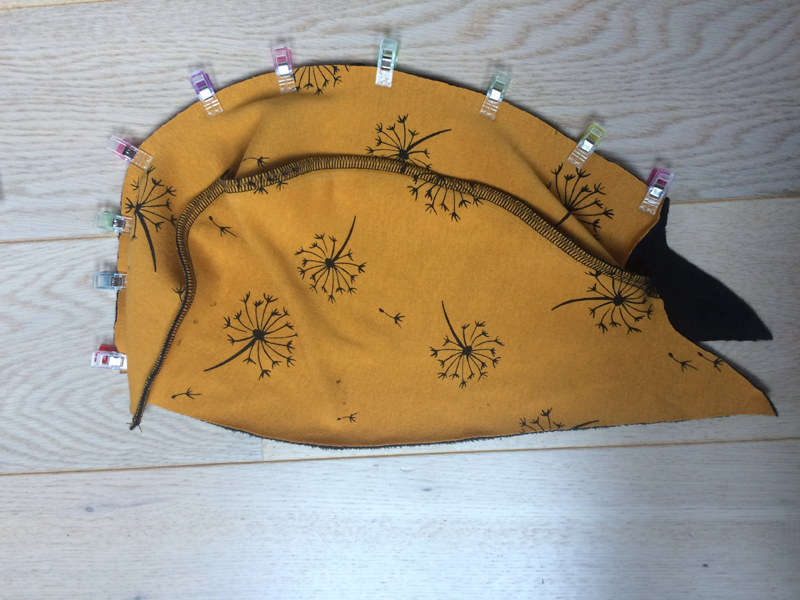 Sew the facing pieces too. Pin the facing to the lining of the hood (face side to face side). In my case: the face side of the facing is the side with the print and the face side of the lining is the “furry” side.