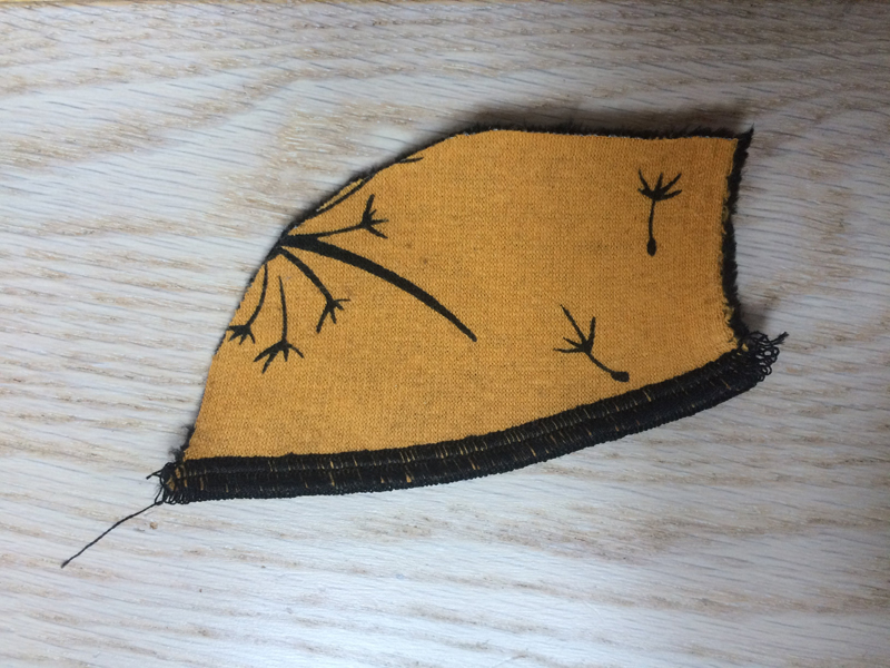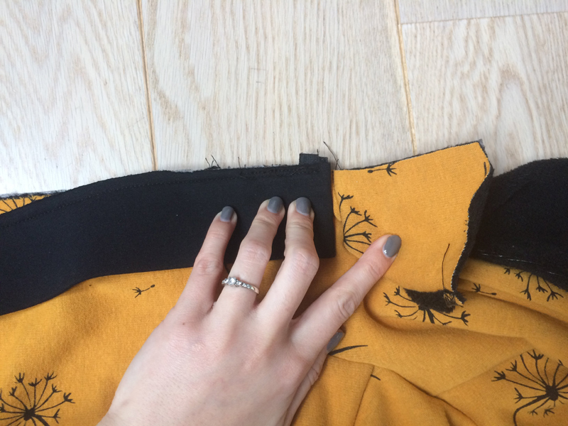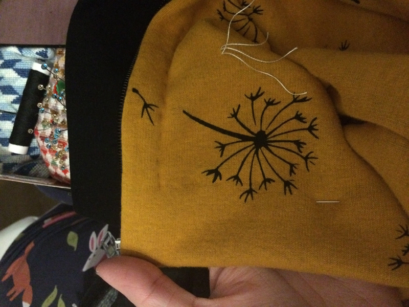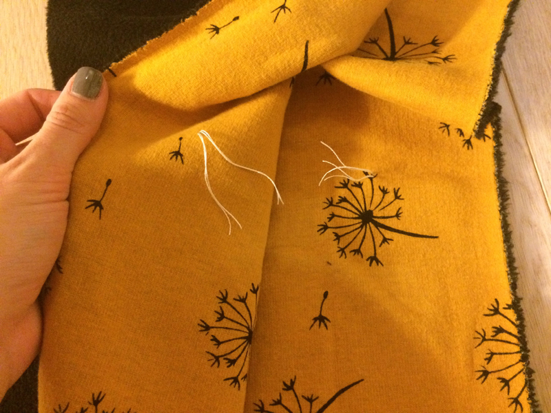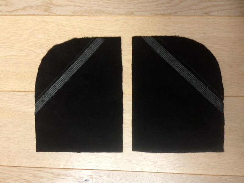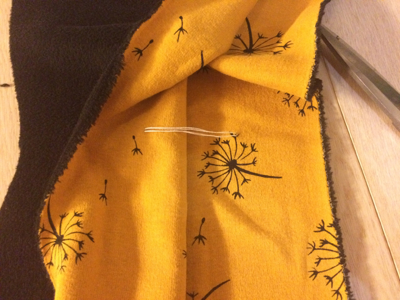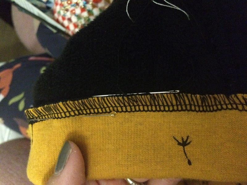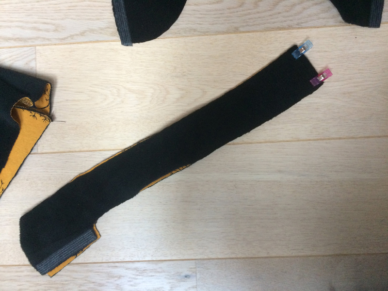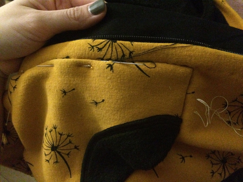 Sew the facing pieces too. Pin the facing to the lining of the hood (face side to face side). In my case: the face side of the facing is the side with the print and the face side of the lining is the “furry” side.