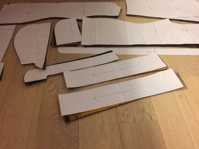 You can save some fabric by positioning the pieces as shown below. Fold the selvage to about two-thirds of the total width, place the back piece on the fold, and the front piece right next to it. Sleeves (one above the other) should fit next to these two pieces. Think about your layout and whether you need to match the print on some pieces. You should also consider the directionality of your fabric when using warmkeeper or some other type of “furry” fabric. The hairs on all parts of the finished garment must point towards the ground.
