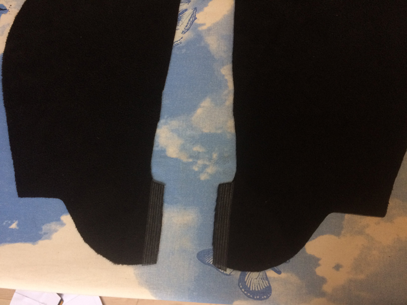 Insert the lining hood to the outer hood (face side to face side) and sew them together. Pin and sew shoulder seams. If you have a heavier material that might get stretched out, you can use a strip of firm cloth (or lastin) to underlay the shoulder seams.