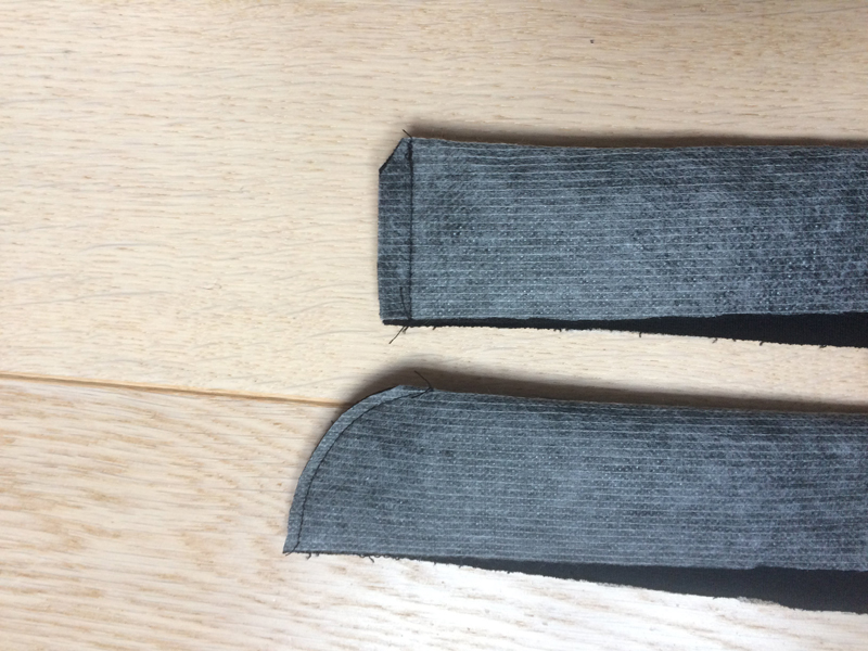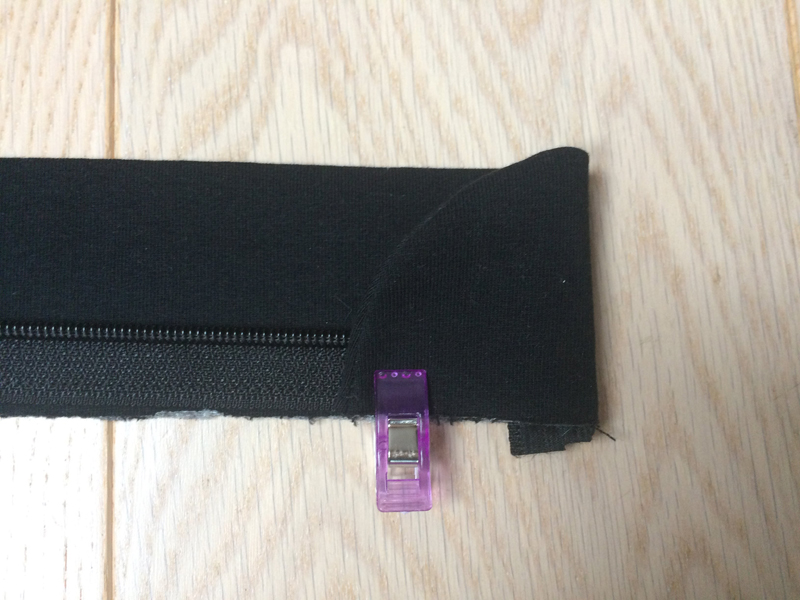 Now is the time to sew the zipper. Let’s prepare its underlap first. Fold previously reinforced zipper underlap in half (lengthwise, face side in) and sew its shorter edges. Then turn it face side out. Iron the piece thoroughly.