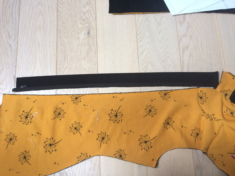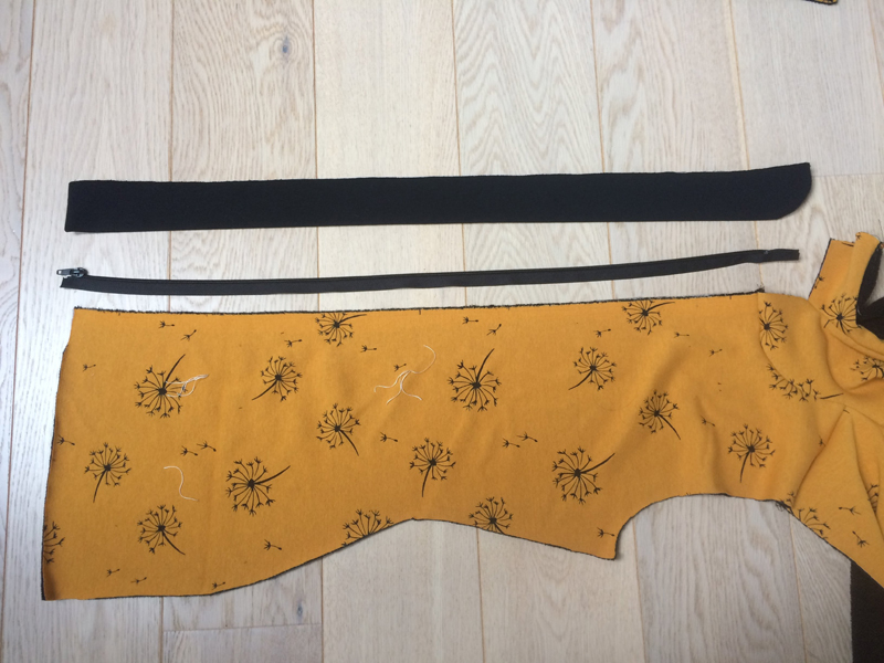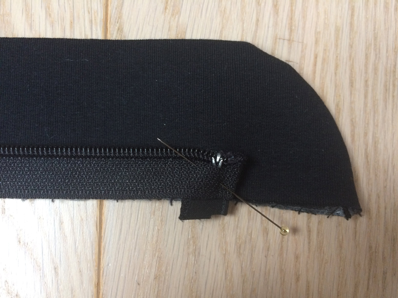 Place the pieces as shown below - the front piece and the first half of the zipper are both face sides up. Lay the zipper (face side up) on top of the zipper underlap. Start at the bottom - the bottom end of the zipper should extend about 1 cm beyond the edge of the underlap. Lay the rest of the zipper on top of the underlap. Fold the surplus part of the zipper tape at the top under itself, twist it towards the edge of the underlap, and pin it there.