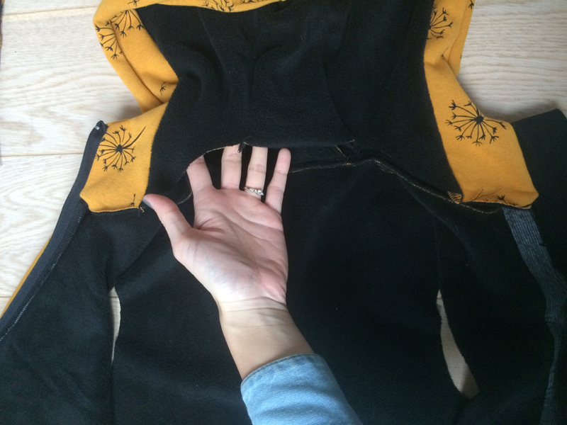 Fold 1 cm (0.4”) of the hood lining edge to the reverse side and pin it to the neckline.