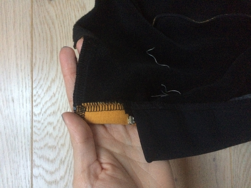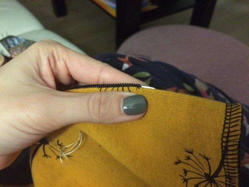 You can now cover part of the zipper by “rolling” edges of the front pieces over the zipper (over its tape, up to the teeth) if you are going for a more elegant look. Pin the rolled parts of the front pieces and topstitch them. Sew (by hand, use small stitches) through the zipper tape as well as the front piece.