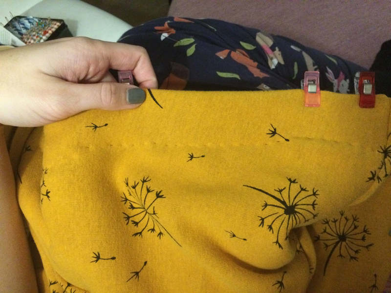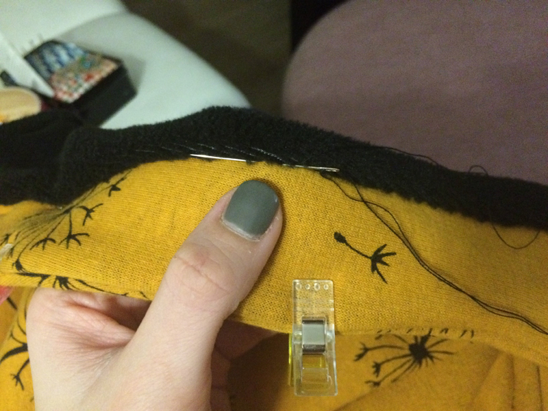 Set your overlock to a denser (shorter) stitch if you want to “decorate” visible edges of the pockets. Also, set higher thread tension for elastic materials. Try your new settings on a piece of scrap fabric and make adjustments if needed. If you want to sew the pockets in the “usual” way (with folded edges), you can clean the edges with a plain overlock stitch or with your regular sewing machine (with a zigzag stitch, for example).